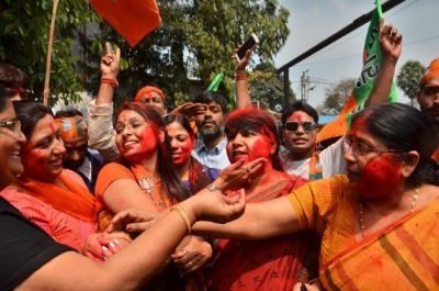 It’s set to be a special ‘Holi’ for India’s Prime Minister Narendra Modi and the Bharatiya Janata Party he leads. Saffron is the reigning colour as wild celebrations erupted outside the BJP’s national headquarters in Delhi and UP’s capital city of Lucknow. Swamped by fervour of this huge victory, party activists splashed a rainbow of colours, distributed sweets and set off crackers.