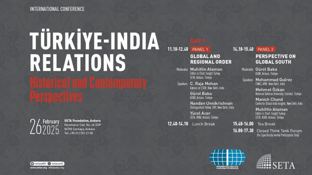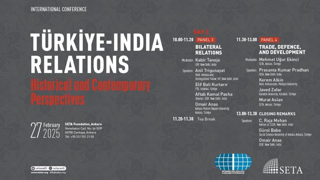 By Shweta Aggarwal Amid the shifting geopolitical landscape and new power equations emerging in the region, experts from leading think tanks of India and Türkiye will exchange perspectives to enhance mutual understanding and knowledge at a two-day conference in Ankara, the first of its kind initiative to build bridges between the two rising powers. The international conference titled, “Türkiye-India Relations: Historical and Contemporary Perspectives,” will be held in Ankara on February 26-27. The conference has been organised by Foundation for Political, Economic, and Social Research (SETA), Ankara and New Delhi-based International Dialogue and Diplomacy Foundation (IDDF), in partnership with the Embassy of India in Turkey.