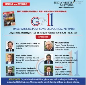 India Writes Network, an emerging think tank and media-publishing platform focused on global affairs, has organised a Virtual Panel Discussion (webinar) on the theme: “From G7 to G11: Unscrambling post-Covid Geopolitical Alphabet,” on July 2 (6 pm IST). The webinar will explore the viability of expanding the G7 grouping to include emerging powers to reflect the ongoing shift in the global balance of power, which has been accelerated by the coronavirus pandemic. The webinar, which will be moderated by Manish Chand, Founder-CEO and Editor-in-Chief, India Writes Network and India and the World, features some of the iconic figures in the world of foreign policy and strategic India. The speakers include: The speakers include: H.E. The Hon Barry O’Farrell, Australia’s High Commissioner to India; Amb. Kanwal Sibal, Former Foreign Secretary, India’s former Ambassador to France and Russia; Amb. Richard Verma Vice-Chair & Partner, The Asia Group, US former Ambassador to India; Amb. Anil Wadhwa: India’s former ambassador to Italy, Thailand and Oman; Gautam Bambawale, India’s former ambassador to China, Pakistan & Bhutan
