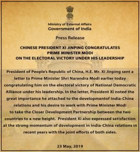 The decisive victory of Prime Minister Narendra Modi’s party in the 2019 elections is set to renew momentum in India-China relations, with President Xi Jinping promptly congratulating the Indian leader on the electoral victory and hoping for stronger partnership between the two countries. In a congratulatory letter to Mr Modi on the electoral victory of the BJP-led National Democratic Alliance, Mr Xi underlined the “great importance he attached to the development of India-China relations and his desire to work with PM Modi to take the Development Partnership between the two countries to a new height.” The Chinese leader “expressed strong satisfaction at the strong momentum of development in India-China relations in recent years with the joint efforts of both sides,” said a statement by India’s Ministry of External Affairs. Mr Xi was among the first few world leaders to congratulate PM Modi on the electoral victory of his party even before the election results were declared publicly.