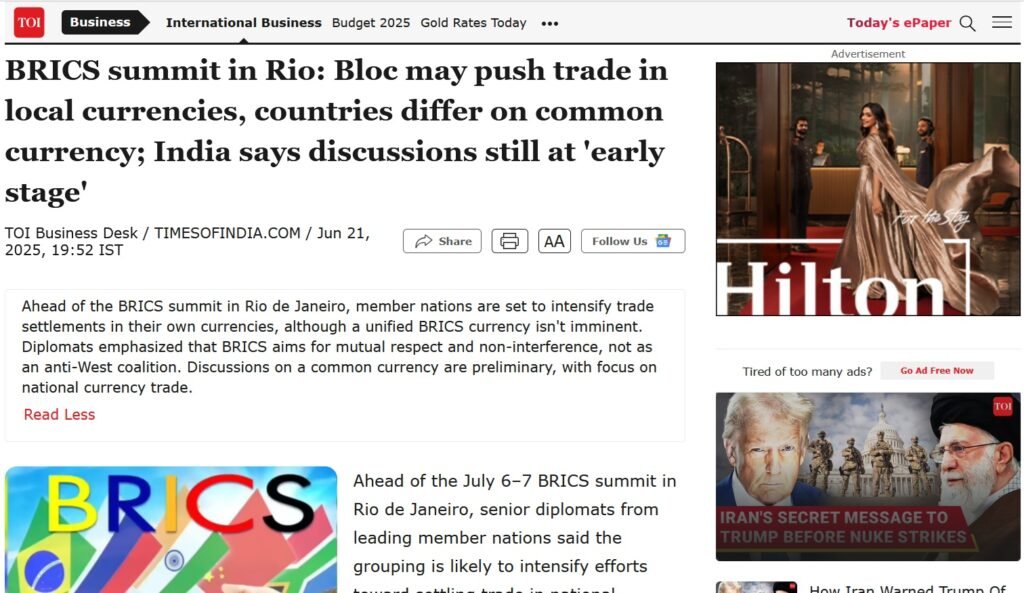 BRICS summit in Rio: Bloc may push trade in local currencies (Times of India)