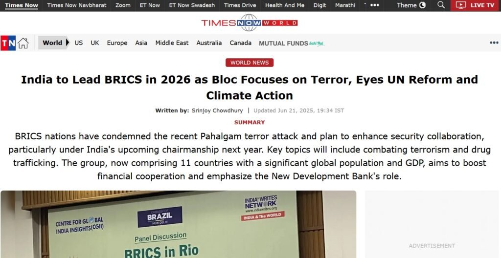 Times Now: India to Lead BRICS in 2026 as Bloc Focuses on Terror, Eyes UN Reform and Climate Action