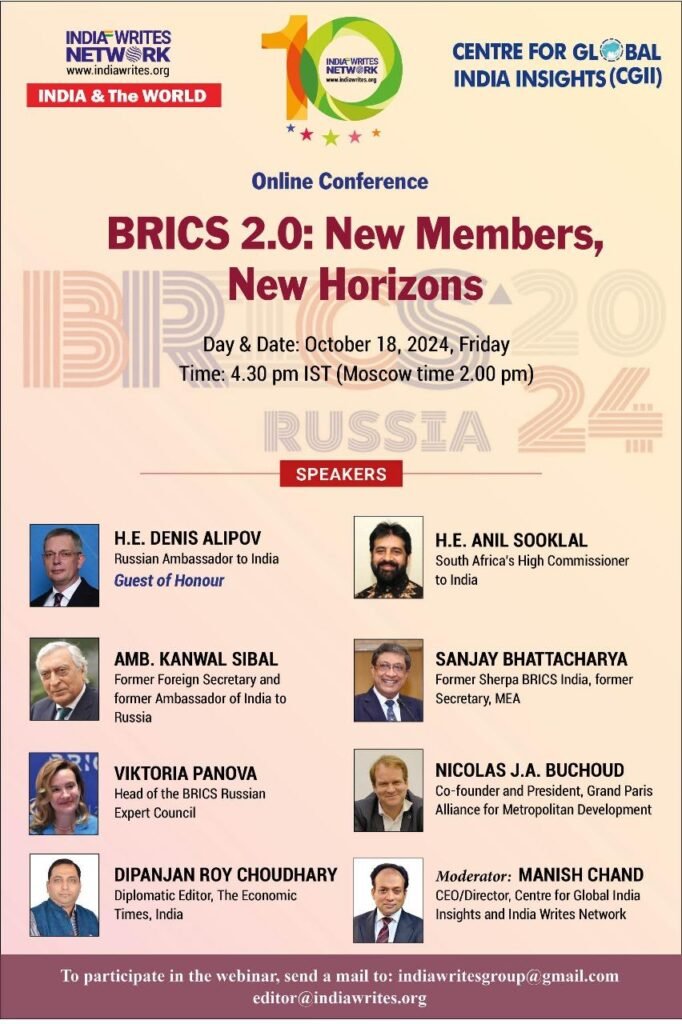 Ahead of the BRICS Summit in Kazan, Centre for Global India Insights and India Writes Network will host an online conference titled “BRICS 2.0: New Members, New Horizons” on October 18. The conference will focus on ramifications of the planned expansion of the BRICS grouping as the grouping of emerging economies prepares to induct additional new members as partner countries during the upcoming summit in Russia. Russian Ambassador to India Denis Alipov will deliver the keynote speech, setting the tone for discussions on the implications of BRICS expansion for the global order. He will underscore Russia’s strategic vision for the group. He has been a key figure in strengthening India-Russia relations and will discuss how an expanded BRICS could create new avenues for cooperation, particularly in trade, defense, and energy sectors. The online conference will be moderated by Manish Chand, CEO, Centre for Global India Insights, a think tank focused on global affairs, and Editor-in-Chief, India Writes Network and India and the World. The online conference brings together a diverse panel of speakers who are well-versed in the geopolitical and economic implications of BRICS’ growth. Ambassador Anil Sooklal, South Africa’s High Commissioner to India and former BRICS Sherpa has been a key player in articulating South Africa’s vision for BRICS, emphasizing the importance of the group’s collective strength in advancing the interests of the Global South. Sooklal’s input will be crucial in understanding how new member states could align with BRICS’ broader developmental agenda. Adding further depth to the conversation, Dr. Kanwal Sibal, former Foreign Secretary of India, will draw on his vast experience to assess how BRICS expansion might impact global diplomatic alignments, especially in the context of emerging multipolarity. Dr. Victoria Panova, a leading voice on BRICS and international cooperation, will share insights from her experience as the Scientific Supervisor of the BRICS Expert Council. Sanjay Bhattacharyya, a former BRICS Sherpa for India, will bring his considerable expertise and first-hand experience to the discussion. Bhattacharyya, who played a pivotal role during India’s BRICS presidency, is expected to shed light on how India views the future of the grouping. The announcement from the last summit in Johannesburg to admit six new members, including major economies such as Saudi Arabia and the UAE, has already begun to shift global perceptions of the bloc. Analysts have pointed out that this move will enhance BRICS’ economic clout, potentially accounting for over 45% of the global population and significant portions of oil production, thus impacting global energy markets. The expansion has raised questions about internal coherence and decision-making. With new members joining, BRICS will need to navigate divergent political systems and economic interests. One of the key motivations behind the push for expansion has been to offer a counterbalance to Western-dominated financial institutions, such as the IMF and World Bank. Through the New Development Bank (NDB), BRICS nations have sought to finance projects on their terms, emphasizing sustainability and equitable growth. However, with the inclusion of new economies, the NDB will need to scale up its operations, which could be a topic of discussion during the Kazan Summit. The “BRICS 2.0: New Members, New Horizons” conference is expected to offer a comprehensive preview of these issues, setting the stage for the forthcoming summit in Russia. With leaders from various domains coming together, the event will not only address the practicalities of BRICS expansion but also reflect on its broader implications for the international system, where power is increasingly decentralized and shared among emerging economies. Event: Virtual Conference: BRICS 2.0: New Members, New Horizons. When: October 18, Friday 4.30 pm-6.15 pm IST; 2 pm-3.45 pm Moscow time, Europe time – 1 pm-2.45 pm The WEBINAR will be broadcast Live via FACEBOOK and YOUTUBE and Twitter. YOUTUBE: https://www.youtube.com/watch?v=EaiFj5W-R88 FACEBOOK: https://www.facebook.com/events/3888101488068164