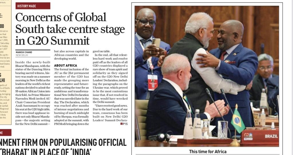 The formal inclusion of the AU as the 21st permanent member of the G20 has made the grouping more representative and future-ready, unveiling an emerging narrative of South-South solidarity and setting the tone for an ambitious and transformational New Delhi Declaration that was unveiled later in the day. The Declaration, which was reached after months of “intense and ruthless” negotiations and burning of much midnight oil by sherpas, was formally adopted at the summit, with PM Modi bringing down the gavel on the table.